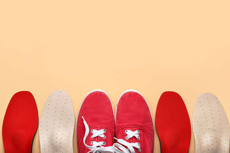 Pair of stylish pink sneakers with orthopedic insoles on beige background