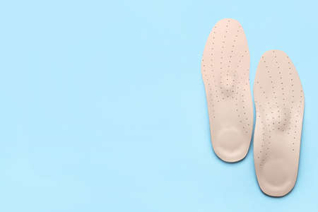 Light blue orthopedic insoles on color background, flat lay. Space for text