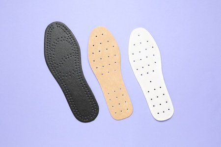 Three types of shoe insoles in varying colors arranged on a soft pastel backdrop. Ideal for comfort and support in footwear.
