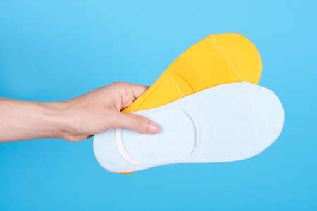 Foot support and healthy feet concept with orthopedic shoe insoles isolated on blue background