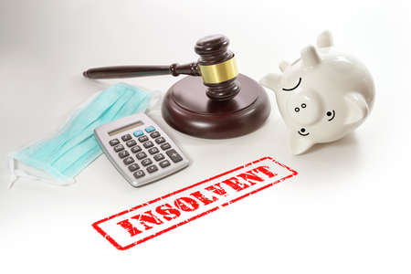 Calculator, surgical mask, judge gavel and a sad piggy bank on its back, red stamp Insolvent, reserves are used up during coronavirus pandemic, gray background is fading to white, copy space, selected focus