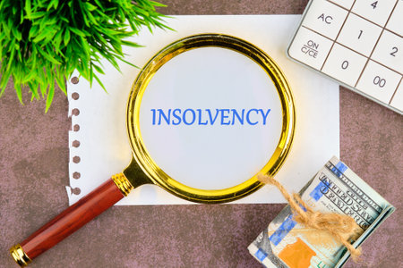 paragraph law symbol. INSOLVENCY word through a magnifying glass in a composition with American dollars, a calculator and a plant