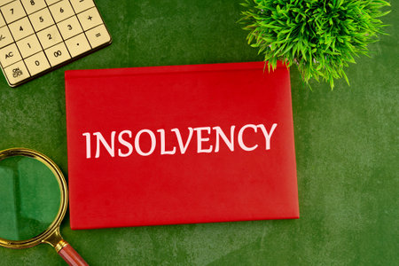 paragraph law symbol. INSOLVENCY word on a red business notebook on a gorgeous green background