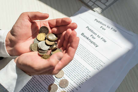 Cropped view of businessman holding coins near petitions for bankruptcy on white textured background