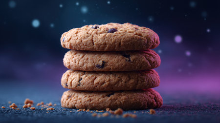 A stack of freshly baked chocolate chip cookies against a vibrant, dreamy background. Perfect for showcasing sweetness and indulgence.