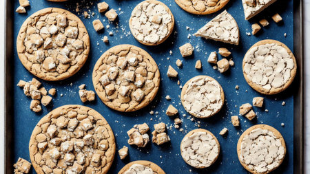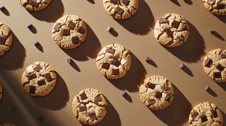 Top view of cookies with chocolate chip pieces on dark beige background. Food pattern. Aesthetic concept. Generative AI.