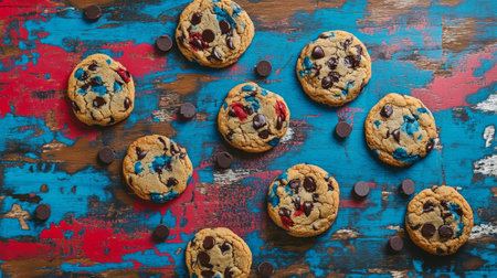 A variety of freshly baked chocolate chip cookies on a weathered blue and red wooden table. Some cookies feature chunks of rich chocolate and vibrant red accents, inviting a sweet treat.