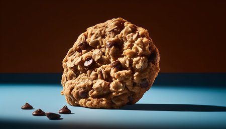 AI Generated. Close-up of a chocolate chip cookie lit by sunlight