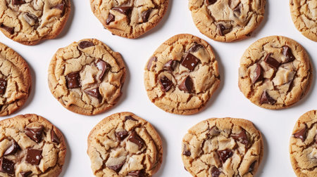 Chocolate chip cookies are arranged in a horizontal line on a white background, creating a visually appealing pattern with scattered crumbs and chocolate chips