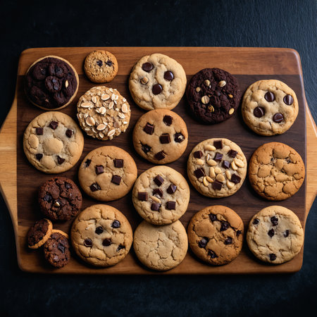 Assorted homemade cookies on wooden board: classic, chocolate chip, oatmeal, and double chocolate.