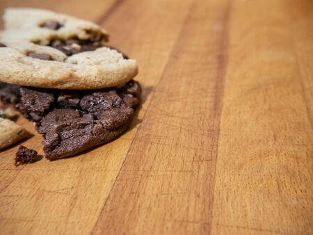 Oatmeal chocolate chip cookies. Cookies on wooden background. Cookies crumbs.