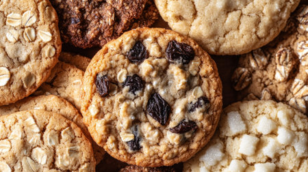 A close-up of a variety of cookies including oatmeal raisin and sugar cookies, with a soft, warm glow highlighting their delicious textures.