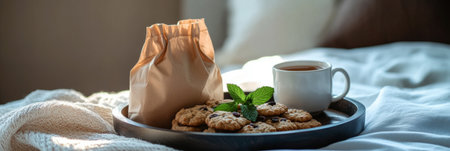 Freshly baked cookies in a paper bag accompany a cup of steaming tea on a wooden tray, creating a warm breakfast setting on a soft bed, banner