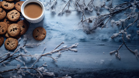 Cup of coffee and cookies on blue wooden background. Winter concept.