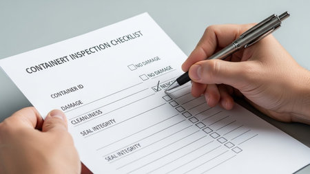 Inspector wearing gloves and uniform examining shipping containers with a clipboard at a cargo terminal. Focus on logistics, safety compliance, and transportation management.
