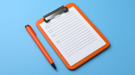 A colorful clipboard with an empty checklist alongside an orange pen on a blue background, perfect for organization, planning, and productivity.