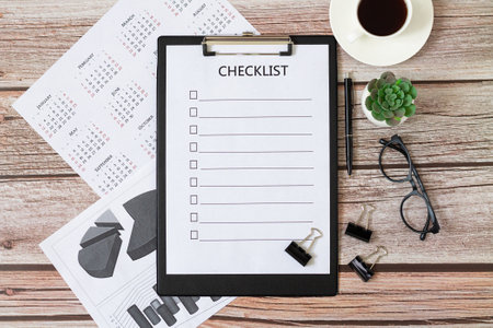Blank Checklist on wooden desk with coffee, glasses, calendar, plants. Business concept top view