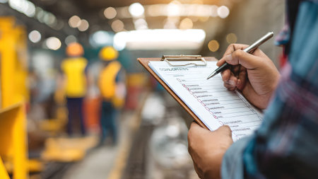 Construction Worker Writing on Clipboard in Industrial Setting with Safety Gear and Hard Hat in Background, Focus on Hands and Tools Engaged in Job Task