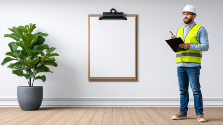 Construction inspector wearing safety vest and hard hat holding clipboard near blank clipboard