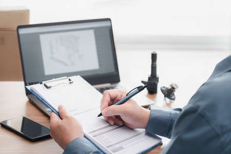 Seaman onboard a ship fills checklist. Paperwork at sea,