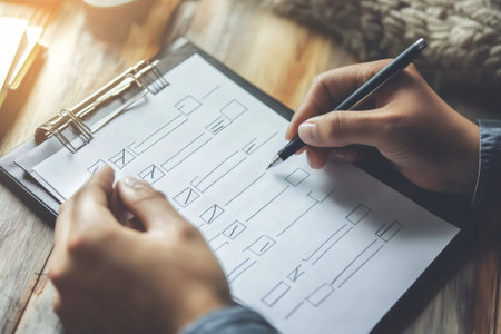 Close up of hands checking off completed tasks on a clipboard checklist, ensuring efficient workflow and project management