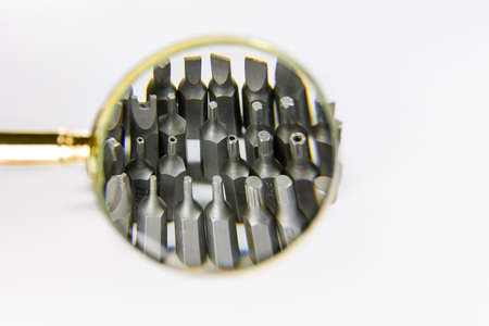 Magnifying glass and Phillips screwdrivers with a yellow and orange pen on a white background. View of tools screwdriver through a magnifying glass