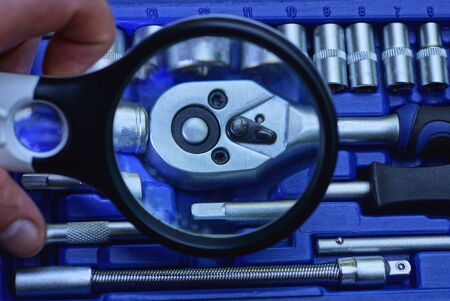 Box with set of tools for car repair, close-up, low key with lens glare.
