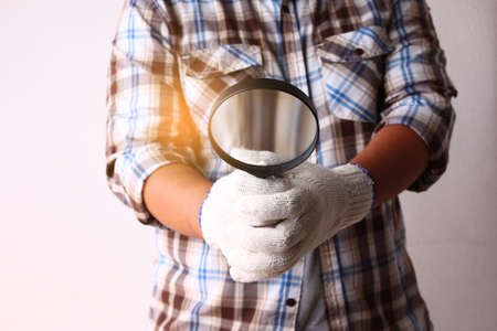 Cropped view of repairman holding magnifier over broken parts of mobile phones on blurred foreground