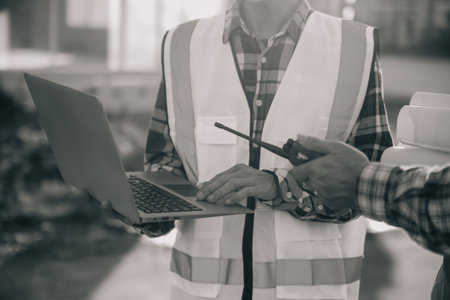 Engineer working with laptop and talking on walkie-talkie at construction site