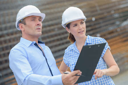 Construction manager and engineer dressed in orange work vests and hard helmets explore construction documentation on the building site near the steel frames