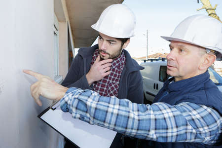 Expert inspector and engineer checking the quality of the walls after finishing the construction of a new home