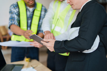 Professional construction engineers team using blueprint of project plan brainstorming and working together at construction building, Architecture and building construction concept