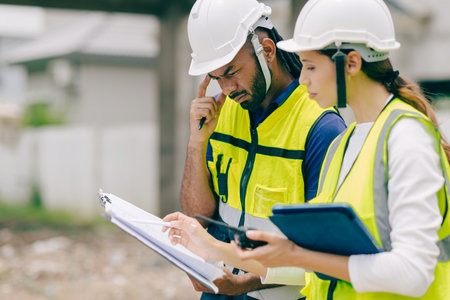 Construction engineer builder stressed solving problem meeting site auditor women with floorplan mistake