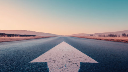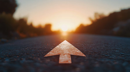 A vibrant sunset casts a warm glow over a road featuring a prominent arrow symbol, guiding viewers towards the horizon. Perfect for themes of travel and motivation.