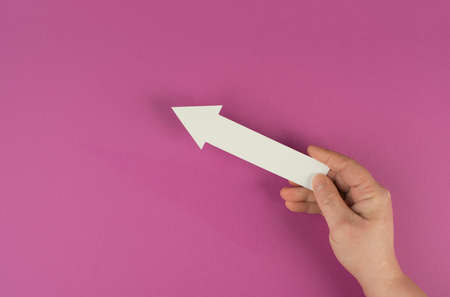 Holding an arrow in the hand, symbol for growth, success and development, pink colored background, copy space for text