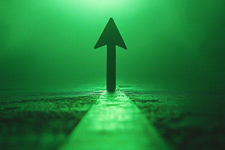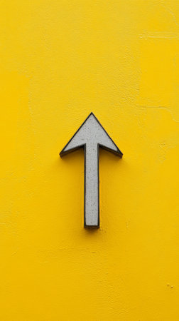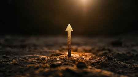 Metallic arrow pointing upwards stands prominently on textured surface, illuminated by warm light, symbolizing hope and direction. scene evokes sense of aspiration and positivity
