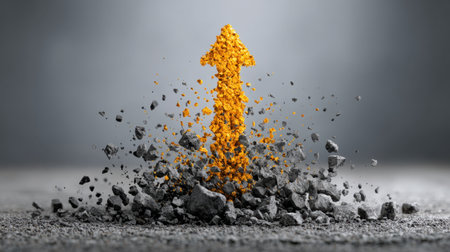 Abstract explosion of orange particles rising from broken concrete, symbolizing growth and progress. dynamic movement conveys energy and transformation in modern setting