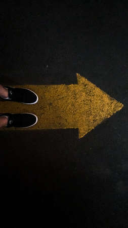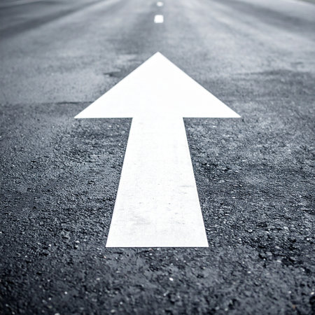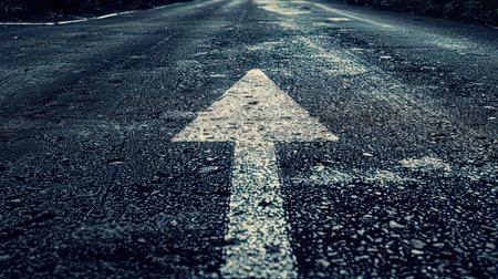 Close-up captures a white arrow marked on a weathered asphalt road, symbolizing forward movement. The arrow's texture contrasts with the pavement, emphasizing direction.