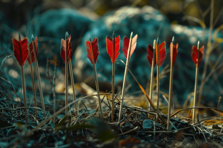 Group of arrows with bright red feather fletchings are bunched together with a shallow depth of field
