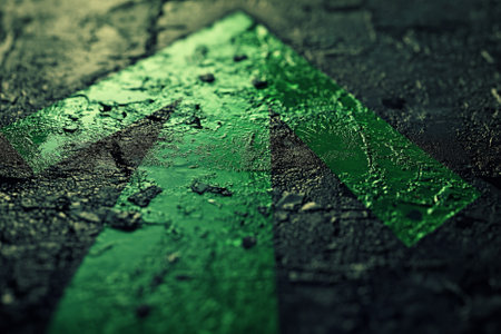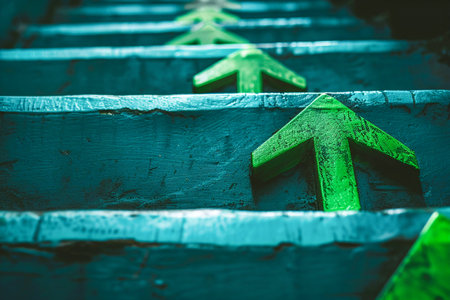 Green arrows on rugged steps, symbolizing upward progress and growth with a textured, urban feel. Generative AI
