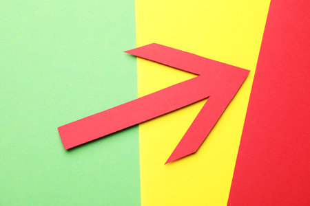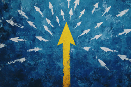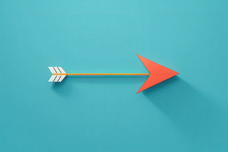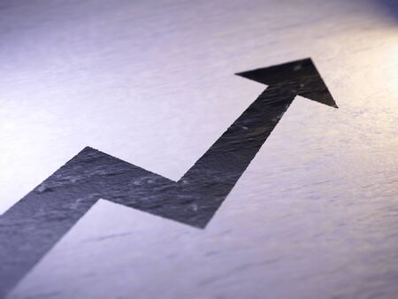 Metallic arrow pointing upwards stands prominently on textured surface, symbolizing growth and progress. background features blend of blue and warm tones, enhancing visual impact