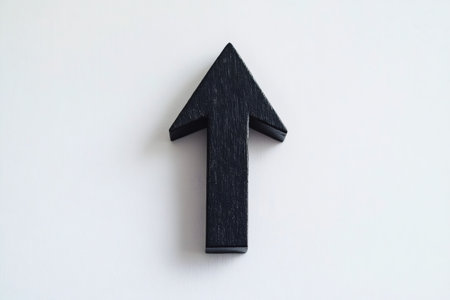 Black wooden arrow pointing upwards symbolizing growth, achievement, and positive momentum on a minimalist white background