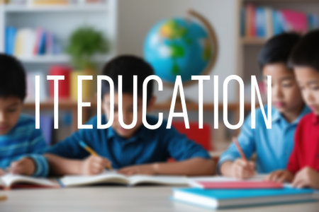 The caption IT Education in front of children in the classroom, immersed in the study of technology and digital skills.