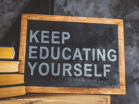 Blackboard near wall with words Keep educating yourself.