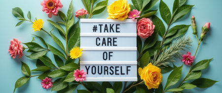 A beautiful display of colorful flowers surrounds a lightbox that reads TAKE CARE OF YOURSELF, promoting self-love and wellness. The bright yellows, pinks, and greens create an uplifting atmosphere, encouraging viewers to prioritize their well-being.