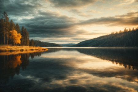 a stunning 8k resolution image featuring a serene lake surrounded by trees and clouds. the layered and atmospheric landscape creates a mysterious backdrop reminiscent of whistlerian art. with its dark teal and light gray tones, this adventure-themed photo captures the breathtaking beauty of nature. ai generated