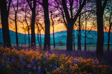 Sunset in the purple forest with wildflowers in the foreground