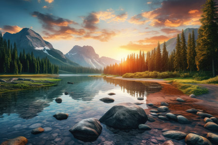 Mountain Lake at sunset. Panoramic view of the mountain lake. Beautiful lake landscape view with green trees, mountains, and sunset, AI Generated