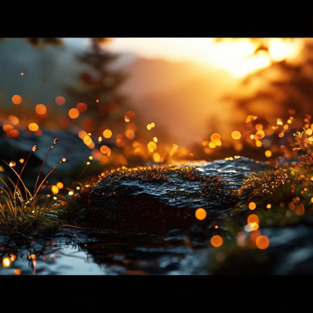 Serene summer forest scene featuring a stream, mossy stones, and play of sunlight and shadows