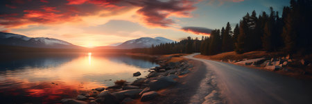 Road near a lake and mountain with sky clouds at sunset.